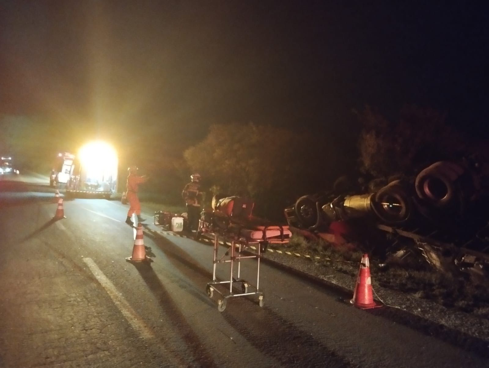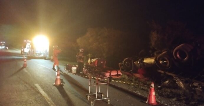 No local as equipes se depararam com uma carreta tombada, com uma vítima do sexo feminino presa às ferragens. Após a operação de desencarceramento, a vítima foi retirada do interior do veículo com vida e consciente, sendo atendida pela equipe do SAMU e encaminhada para um hospital da região. O motorista da carreta não se feriu no acidente.