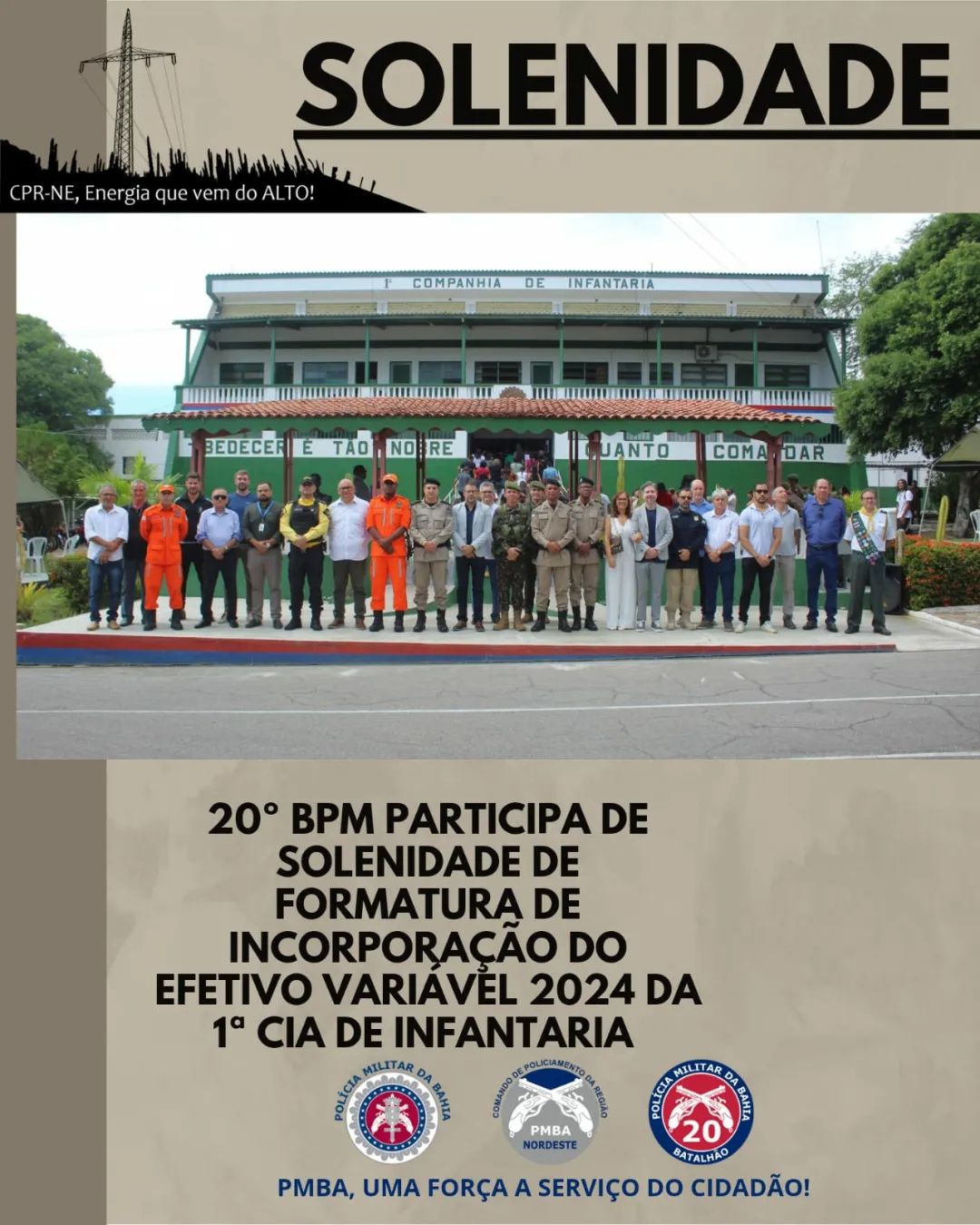 Nesta sexta-feira (01), o Ten Cel PM Sena, Comandante do 20⁰ BPM, participou da Solenidade de Formatura de Incorporação do Efetivo Variável 2024 da 1ª Cia de Infantaria do Exército Brasileiro, evento ciceroneado pelo Comandante Ten Cel EB Matias.