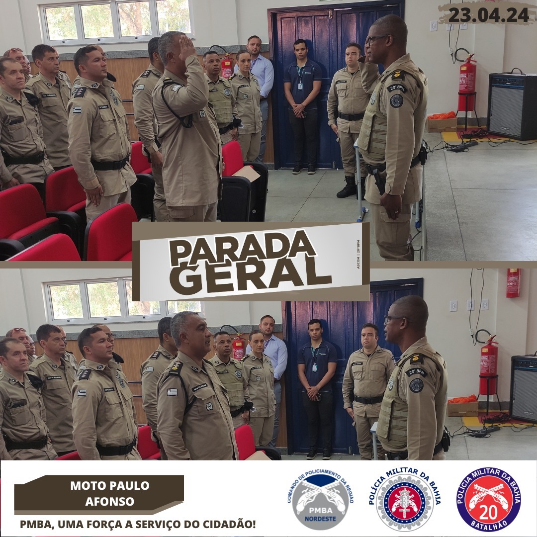 A Polícia Militar da Bahia (PMBA), por meio do 20º BPM, sob o comando do Ten Cel PM Sena, subordinado ao CPR-NE comandado pelo Sr. Cel PM César Albuquerque, realizou na manhã de hoje, 23 de abril, a Parada Geral no auditório do CETEP I. O Ten Cel PM Sena presidiu a solenidade, com a presença do Maj PM Estevam, Subcomandante da unidade, além de outros Oficiais e praças que prestigiaram o evento.