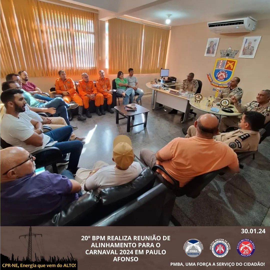 A Polícia Militar da Bahia (PMBA) através do 20º BPM, comandado pelo Ten Cel PM Sena, subordinado ao CPR-NE, comandado pelo Sr. Cel PM César Albuquerque, realizou dia de ontem (30), reunião de alinhamento para o Carnaval 2024 em Paulo Afonso. Estiveram presentes o Ten Cel PM Sena – comandante do 20ºBPM, Maj PM Estevam – subcomandante, Cap PM Rios – chefe do Planejamento Operacional, representantes da administração pública municipal, diretores de blocos carnavalescos e empresários. Repetindo a receita de sucesso de eventos anteriores, onde o trabalho cooperado das diversas instâncias públicas e privadas resultou em festas que ocorreram com toda tranquilidade, foram alinhados os detalhes para os desfiles de blocos (arrastões) e shows musicais, tanto no Centro quanto no Bairro Tancredo Neves.