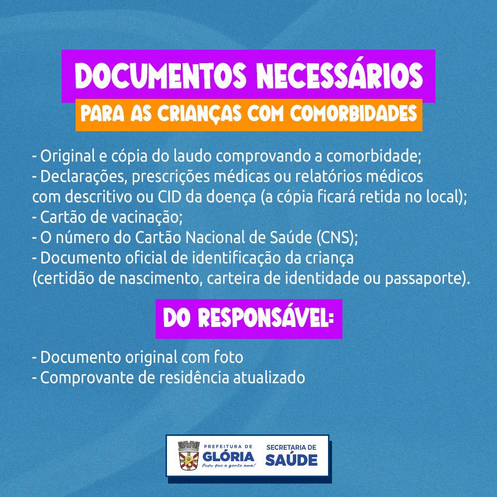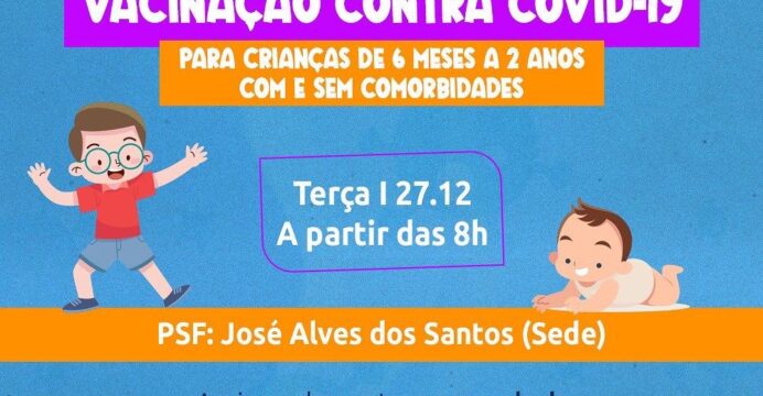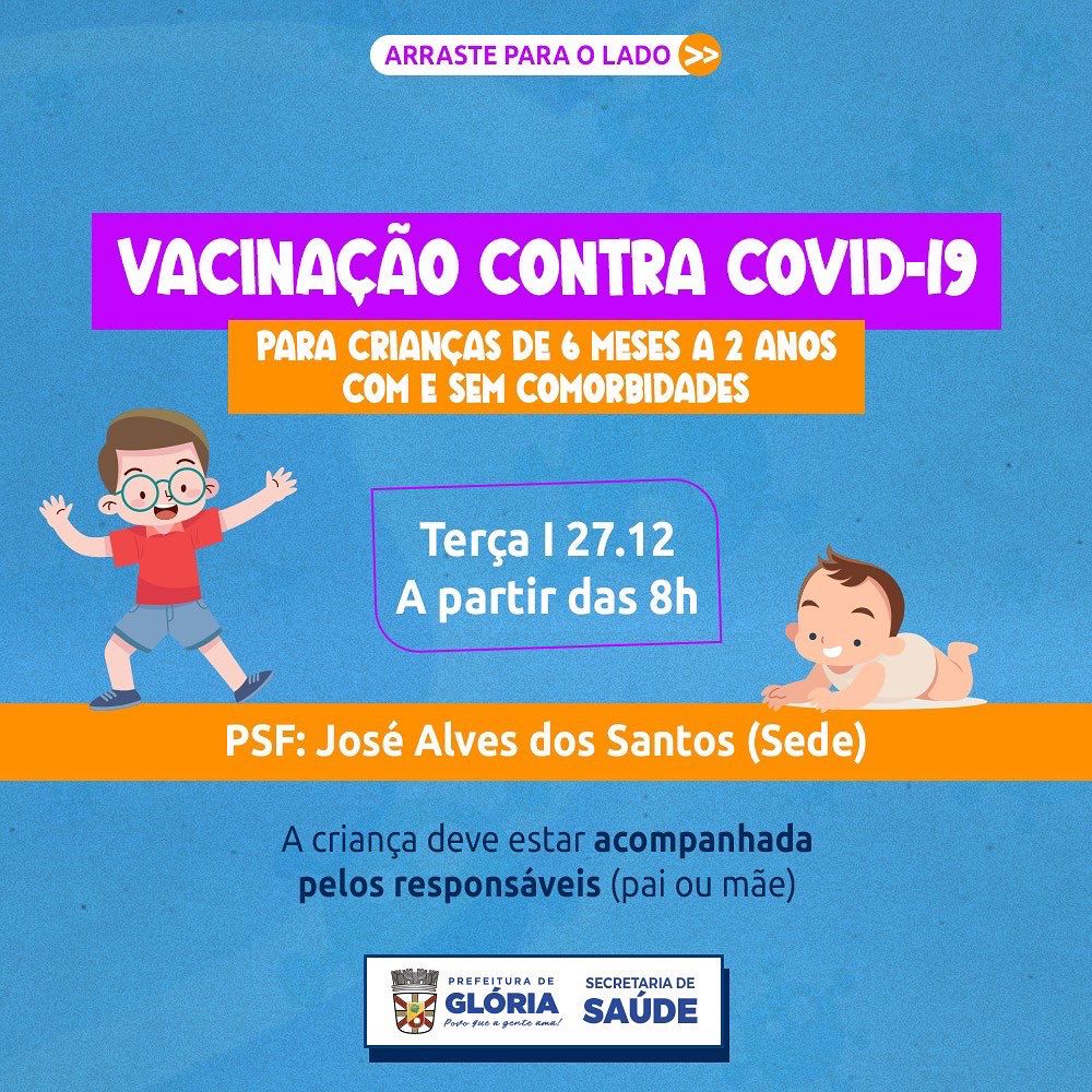 A Prefeitura Municipal de Glória Bahia, através da Secretaria Municipal de Saúde informa para os munícipes que chegou a hora da vacinação das nossas crianças de 06 meses a 02 anos de idade com e sem comorbidade. Papai, mamãe ou responsáveis fiquem atentos, será nesta terça-feira, 27/12, a partir das 08h, no PSF José Alves dos Santos na Sede do município.