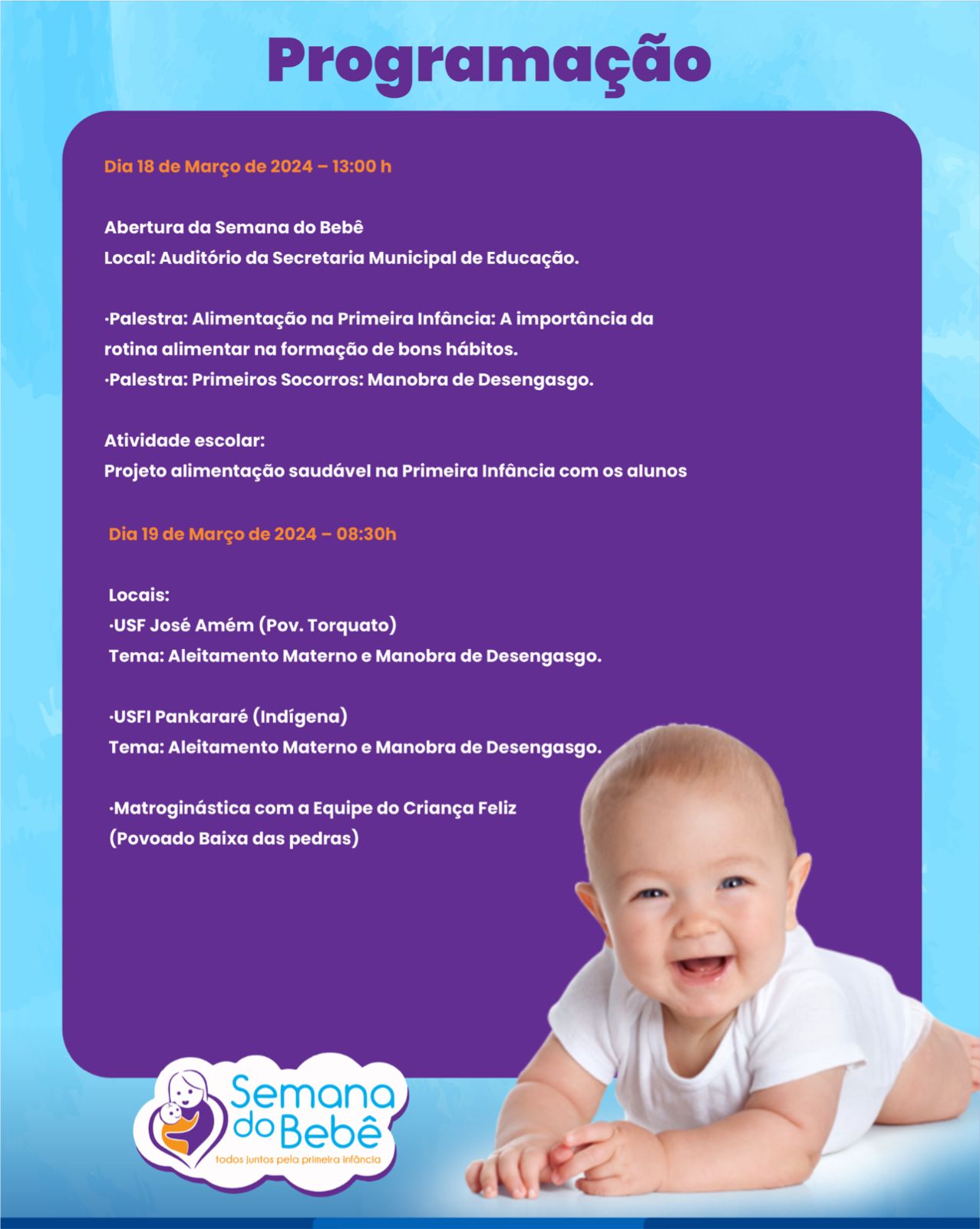 A abertura da semana do Bebê será na Segunda feira dia 18 de Março de 2024 – 13:00h no Auditório da Secretaria Municipal de Educação, com uma programação variada, nesse dia, teremos palestras com profissionais especializados. Palestra: Alimentação na Primeira Infância: A importância da rotina alimentar na formação de bons hábitos com a Nutricionista da educação Priscila Fernandes e a Palestra sobre Primeiros Socorros: Manobra de Desengasgo com o Coordenador Enfermeiro Sérgio Araújo e a toda equipe do SAMU.