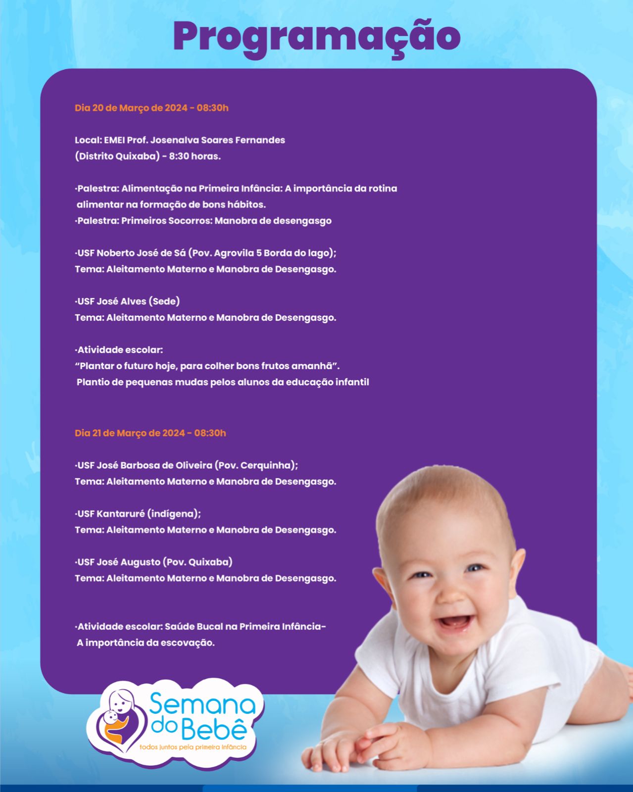 Durante a semana, a programação continua nas Creches e Escolas da Educação Infantil e nas Unidades de Saúde da Família com orientações e palestras que tratam sobre o cuidado na primeira infância. Nas Unidades de Saúde da Família, os 7 postos do município farão parte das atividades, com palestras nas salas de espera abordando temas como a importância do aleitamento materno e como realizar os primeiros socorros – manobra de desengasgo. No dia 20 de março no EMEI Prof. Josenalva Soares Fernandes (Distrito Quixaba) – 8:30h teremos a palestra: Alimentação na Primeira Infância: A importância da rotina alimentar na formação de bons hábitos com a Nutricionista do NASF Clara e a Palestra sobre Primeiros Socorros: Manobra de Desengasgo com o Coordenador Enfermeiro Sérgio Araújo e a toda equipe do SAMU.