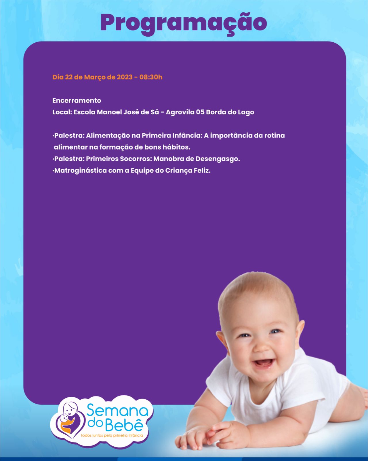 E o encerramento acontecerá no dia 22 de Março na Escola Manoel José de Sá no Povoado Agrovila 05 – Borda do Lago com uma manhã repleta de conhecimento e atividades. Teremos a Palestra sobre Alimentação na Primeira Infância: A importância da rotina alimentar na formação de bons hábitos realizada pela Nutricionista da Educação Flávia Juliana e a Palestra Primeiros Socorros: Manobra de Desengasgo com o coordenador Enfermeiro Sérgio Araújo e a toda equipe do SAMU, além da atividade de Matroginástica com a Equipe do Criança Feliz para animar a manhã.