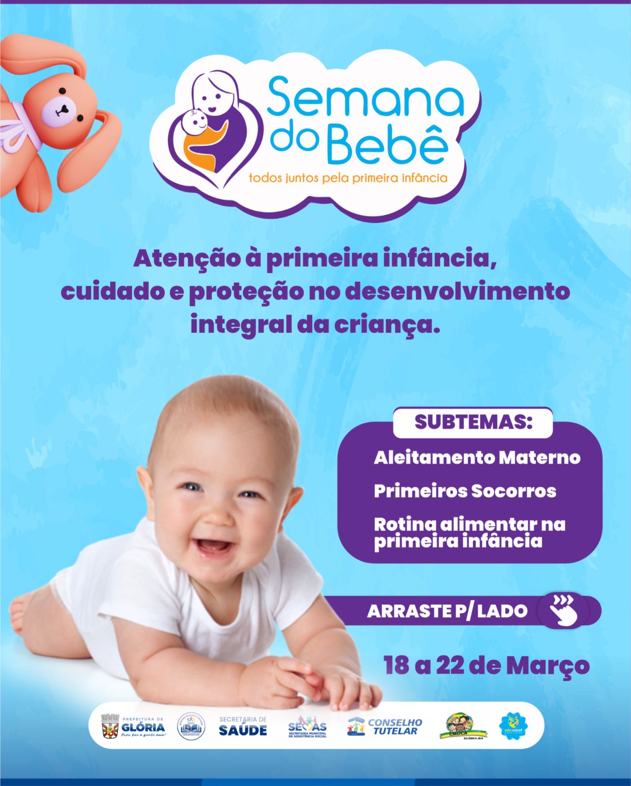 A Prefeitura de Glória, através da Comissão do Selo UNICEF, tem a honra de convidar o querido povo gloriense para participar da Semana do Bebê nos dias 18 a 22 de Março de 2024, cujo tema central é: Atenção à primeira infância, cuidado e proteção no desenvolvimento integral da criança.