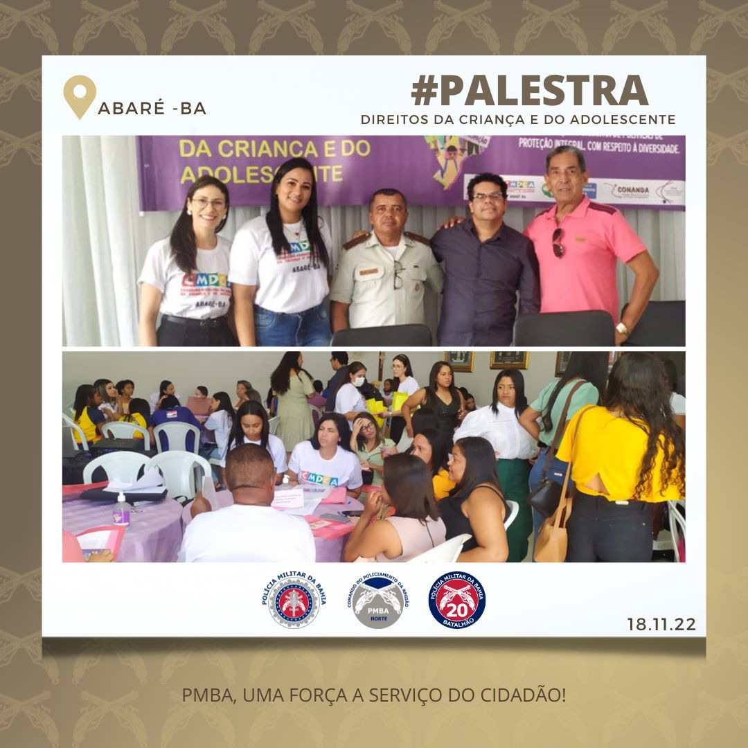 A Polícia Militar da Bahia (PMBA), através do 20º Batalhão de Polícia Militar (BPM/ Paulo Afonso-BA, Unidade Operacional comandada pelo Ten Cel PM Gabriel Neto, subordinada ao Comando de Policiamento da Região Norte (CPR-N), comandado pelo Coronel PM Valter Araújo participou, nesta sexta-feira (18), na Câmara Municipal de Abaré, da Palestra sobre Direitos da Criança e do Adolescente. Nesta Sexta-feira (18), o Subten PM Elson Almeida da Silva participou de uma Palestra sobre os Direitos da Criança e do Adolescente, promovido pela (CMDCA) Conselho Municipal dos Direitos da Criança e do Adolescente, Secretaria Municipal de Desenvolvimento Social da cidade de Abaré.