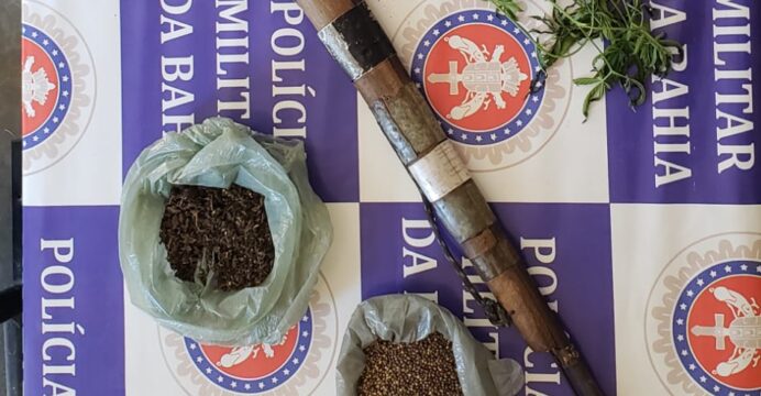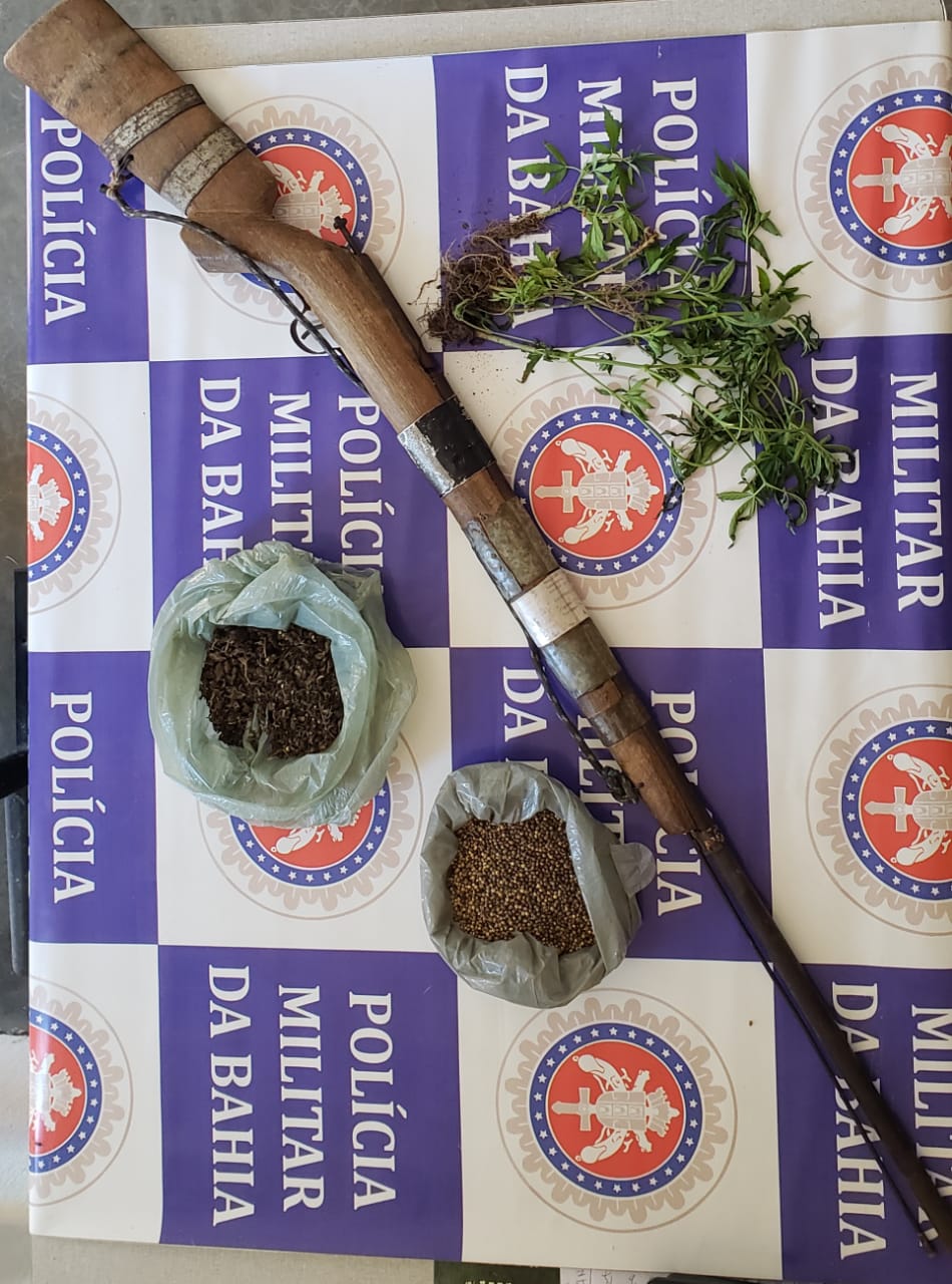 MATERIAL APREENDIDO: 01 (uma) Espingarda (Artesanal), tipo: antecarga 240 ( duzentos e cinquenta) gramas de semente de Cannabis Sativa 55 (cinquenta e cinco) gramas de Cannabis Sativa pronta para o consumo 05 (cinco) pés de Cannabis Sativa (amostra) 50 (cinquenta) pés (aprox) Cannabis Sativa (Plantação destruída no local)