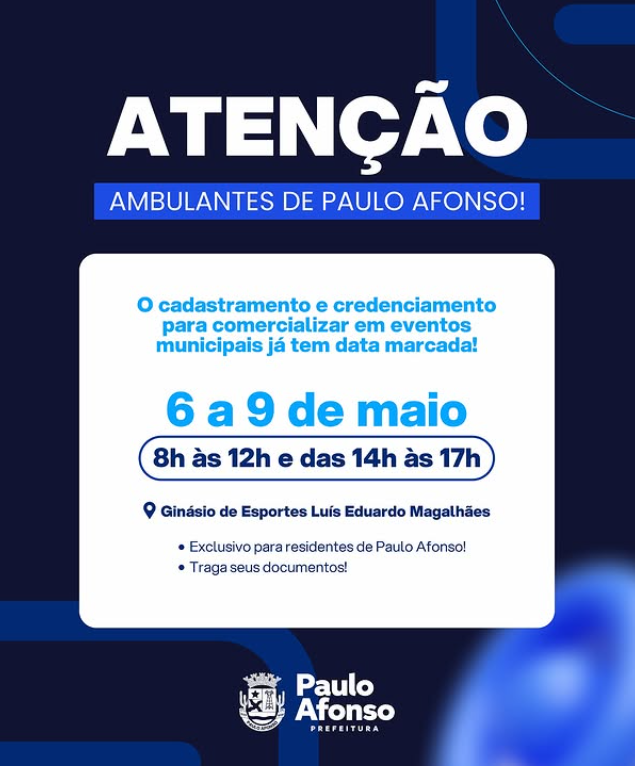 A Prefeitura de Paulo Afonso, por meio da Secretaria Municipal de Cultura e Esportes, abriu o cadastramento e credenciamento de vendedores ambulantes interessados em atuar nos eventos oficiais do Município.