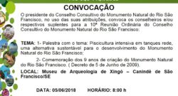 O Presidente do Conselho Consultivo do Monumento Natural do Rio São Francisco Emerson Leandro Costa de Oliveira, no uso das suas atribuições, convoca os Conselheiros(as) Titulares e/ou Suplentes, para a 10ª Reunião Ordinária do Conselho Consultivo...