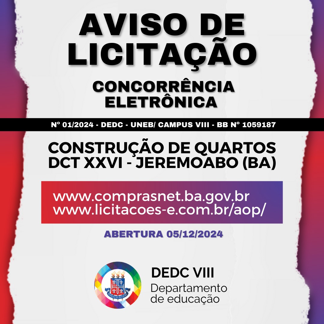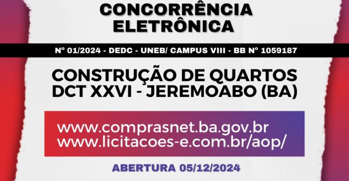 nº 01/2024 – DEDC – UNEB/ CAMPUS VIII – BB Nº 1059187 – Abertura 05/12/2024, às 09h00min. (Horário de Brasília). Objeto: CONSTRUÇÃO DE QUARTOS DCT XXVI – JEREMOABO (BA). Família: 07.05. O Edital poderá ser obtido através dos sites www.comprasnet.ba.gov.br e https://www.licitacoes-e.com.br/aop/. Os interessados poderão entrar em contato através do e-mail: rvsgomes@uneb.br, telefone (75) 3281-6585/7356 ou presencialmente, de segunda a sexta-feira, das 09h00min às 16h00min, no endereço: Rua Bom Conselho, 179 – Bairro Alves de Souza – Paulo Afonso (BA), 18/11/2024. Rogéria Vilela da Silva Gomes – Agente de Contratação.