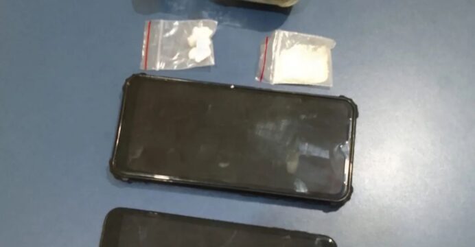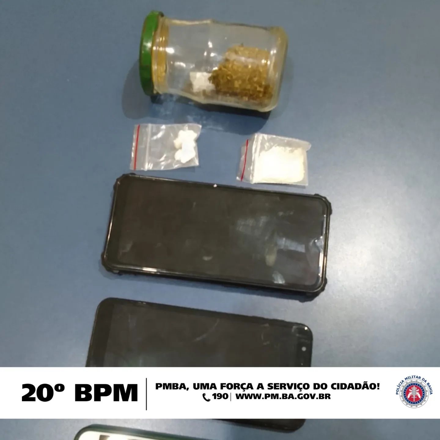 Feita a abordagem, e encontrado com o suspeito 03 celulares, 03 pequenas embalagens plásticas contendo substância análoga a cocaína, 01 porção de erva seca esverdeada, análoga a maconha, e foi verificado que possuía mandado de prisão em seu desfavor.