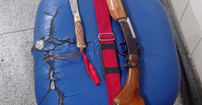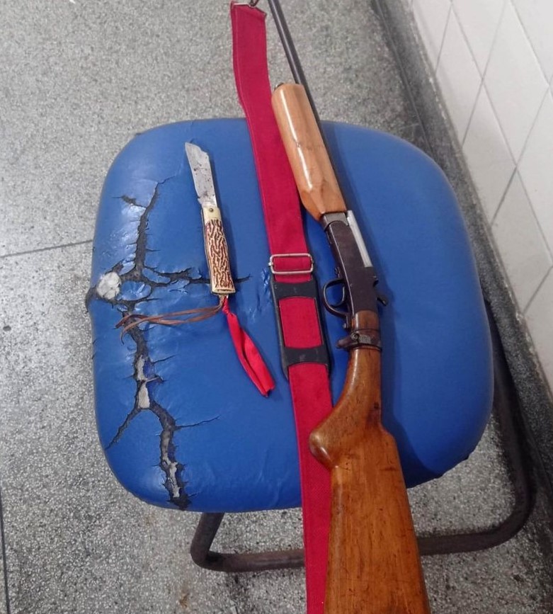 A espingarda, o canivete e o irmão que forneceu as informações foram levados à delegacia para as providências legais e investigações subsequentes.