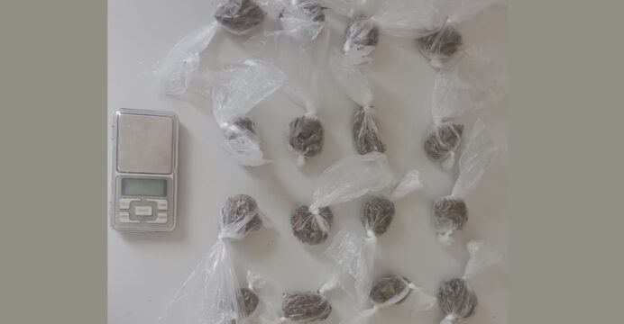 No interior da moradia, foram encontrados, próximo à porta de entrada, uma mochila plástica de cor laranja, contendo dezessete pequenas porções de maconha e uma pequena balança de precisão, sem marca aparente, na cor prata.