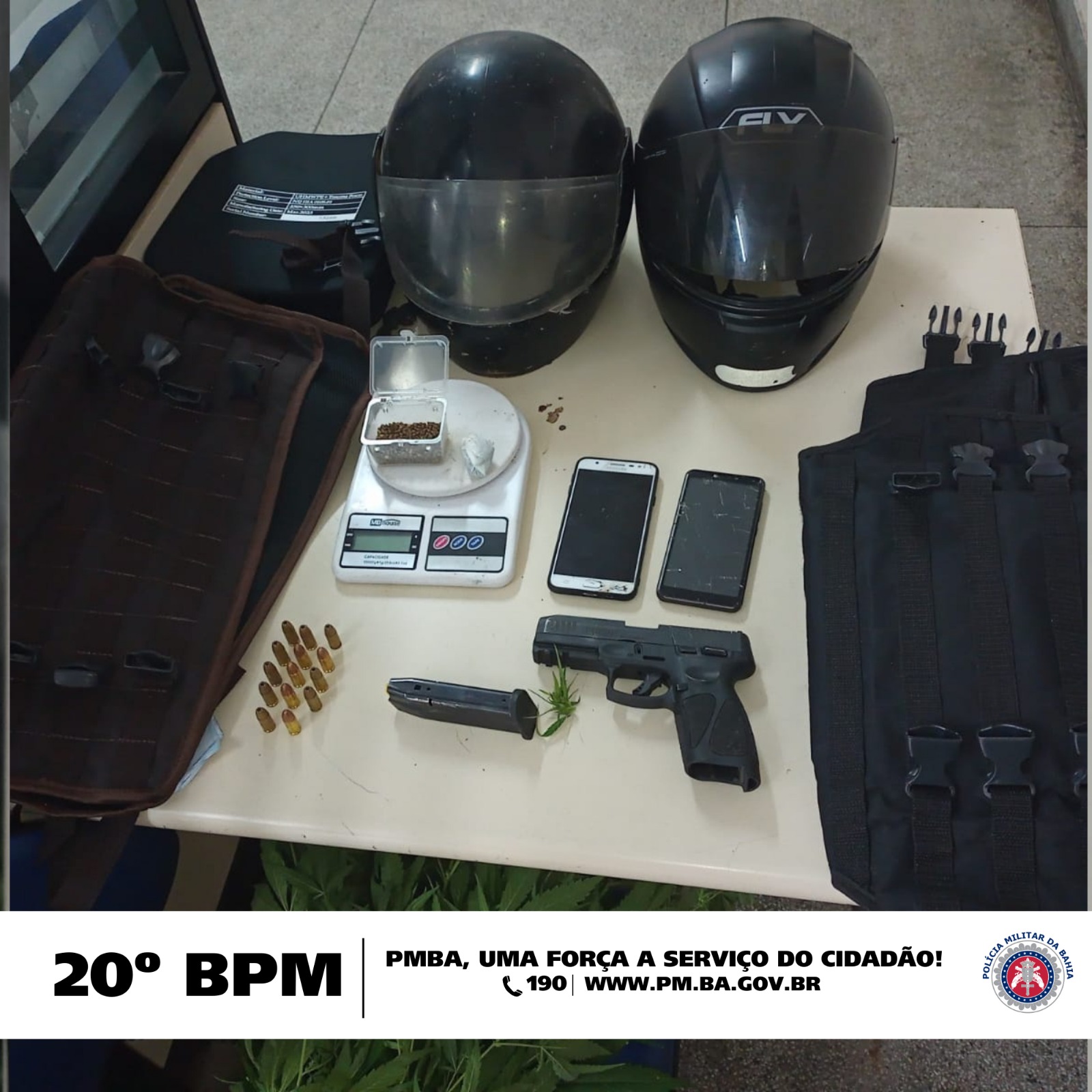 Foi feito o acompanhamento e nas imediações do Bairro Seriema os indivíduos foram alcançados e abordados, que na busca pessoal, foi encontrado uma arma de fogo, tipo Pistola Cal. 9mm, marca Taurus, com numeração suprimida e um carregador municiado com 14 cartuchos intactos com o condutor, que também estava vestido com um colete balístico, com o carona também foi encontrado outro colete balístico.