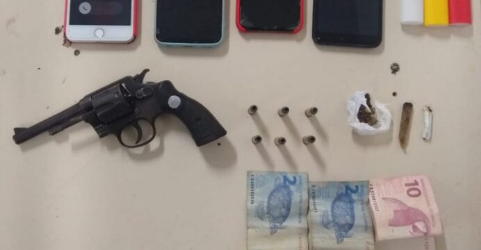 Em 08 de abril de 2023 por volta das 23h, a guarnição do Motopatrulhamento estava realizando ronda no BTN 02, quando abordou um veículo VW Golf, cor branca, com três ocupantes, que ficaram nervosos com a ação de fiscalização veicular. Diante da suspeita, foi realizada busca no veículo e foi encontrado um revólver Cal. 32, uma porção de droga e celulares.