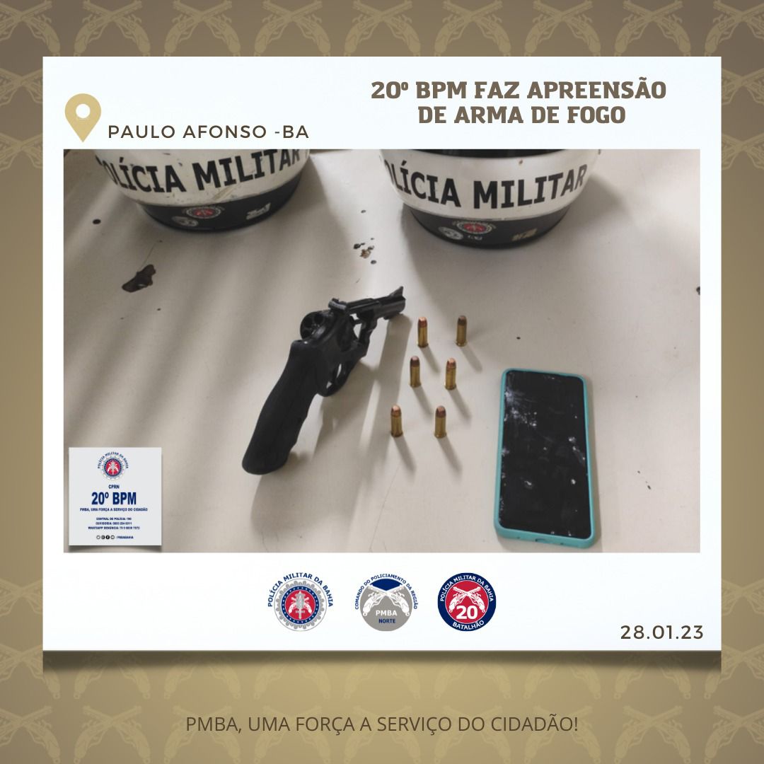 A Polícia Militar da Bahia (PMBA), através do 20º Batalhão de Polícia Militar (BPM/ Paulo Afonso-BA),  prendeu, neste sábado (28), um indivíduo que portava uma arma de fogo em Paulo Afonso-BA. Por volta das 21h15, a guarnição intensificava rondas e abordagens a indivíduos, quando avistou uma motocicleta Yamaha Factor 125cc cor branca com dois elementos, sendo identificado um volume na cintura do garupa.
