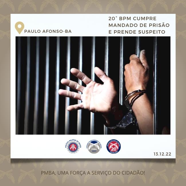 A Polícia Militar da Bahia (PMBA), através do 20º Batalhão de Polícia Militar (BPM/ Paulo Afonso-BA, prendeu, nesta terça-feira (13), em Paulo Afonso-BA, um indivíduo com mandado de prisão em aberto. Por volta das 22h30min, durante cumprimento de intensificação do policiamento, um indivíduo, ao avistar a guarnição tentou evadir-se, mas foi alcançado.