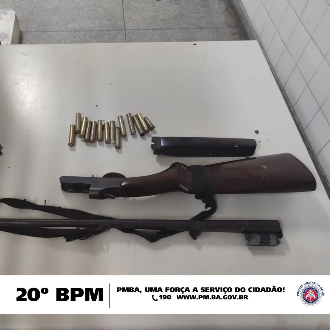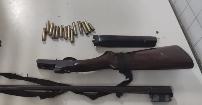 Por volta das 22h, em patrulhamento pela Zona Rural, foi avistado um suspeito de posse de uma arma de fogo, tipo espingarda. Ao perceber a presença dos militares, o suspeito empreendeu fuga pelo mato, deixando pra trás a arma e munições. Todo o material foi apresentado na delegacia territorial para a adoção das medidas cabíveis.