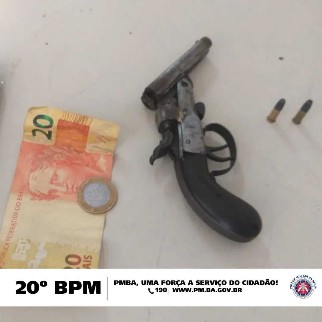 Por volta das 10h20min, durante patrulhamento, foi abordado um indivíduo com comportamento suspeito. Durante a abordagem, foi encontrada em sua cintura, uma arma de fogo calibre 22, com 02 munições intactas.