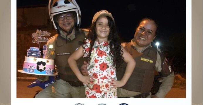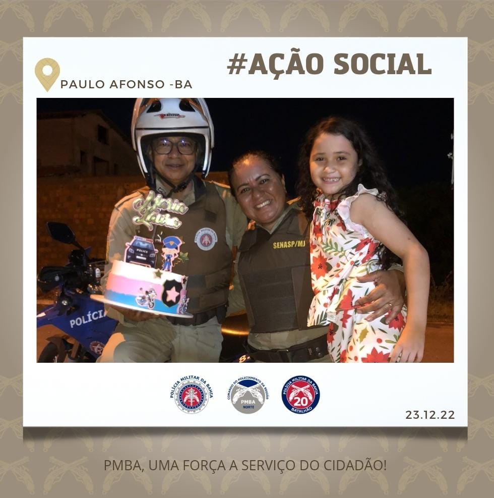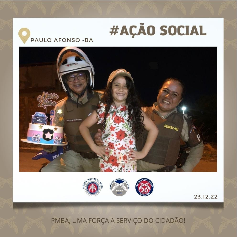 A Polícia Militar da Bahia (PMBA), através do 20º Batalhão de Polícia Militar (BPM/ Paulo Afonso-BA, Unidade Operacional comandada pelo Ten Cel PM Gabriel Neto, subordinada ao Comando de Policiamento da Região Norte (CPR-N), comandado pelo Coronel PM Valter Araújo participou, nesta sexta-feira (23), em Paulo Afonso, da festa de aniversário de uma criança. Nesta sexta-feira (23), provocados pelos pais da garota Maria Laura de sete anos de idade, que sonha ser Policial Militar, a guarnição se fez presente no seu natalício para fortalecer ainda mais a sua aspiração e fazê-la sentir de perto a emoção, os símbolos, e os nossos valores institucionais.