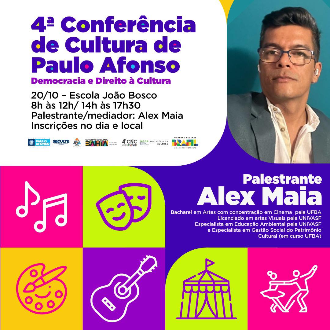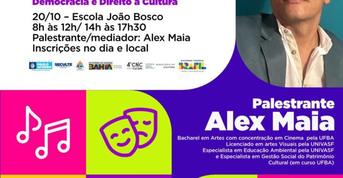 A programação, que tem como tema “Democracia e Direito à Cultura”, contará com palestra mediada por Alex Maia, que é Bacharel em Artes com concentração em Cinema pela UFBA, Especialista em Educação Ambiental pela UNIVASF e Especialista em Gestão Social do Patrimonio Cultural.