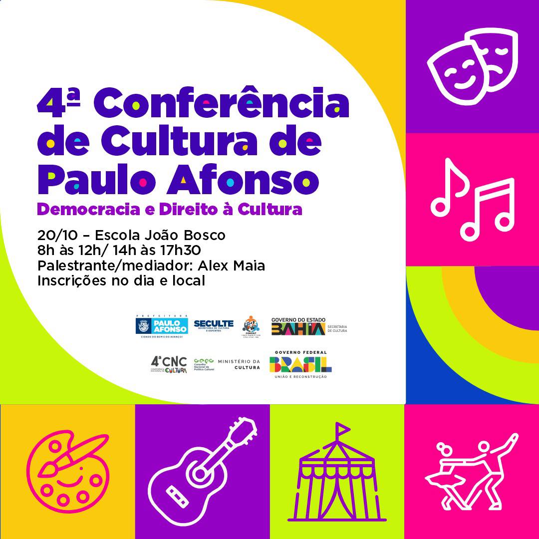 Colabore para o fortalecimento da cultura no município e participe nesta sexta-feira (20) da 4ª Conferência de Cultura de Paulo Afonso. O evento será realizado na Escola João Bosco, das 8h às 12h e das 14h às 17h30.