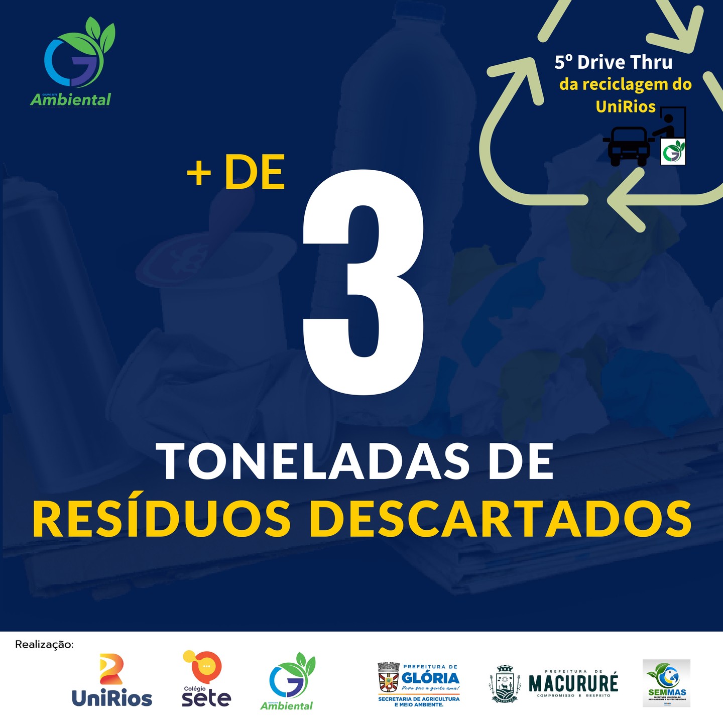 A 5ª edição do Drive Trhu da Reciclagem do UniRios, e 1ª intermunicipal, realizada no início de junho/2023, recebeu + de 3 toneladas de resíduos, entregues nos ecopontos dos municípios de Paulo Afonso, Glória, Jeremoabo e Macururé, no Estado da Bahia.