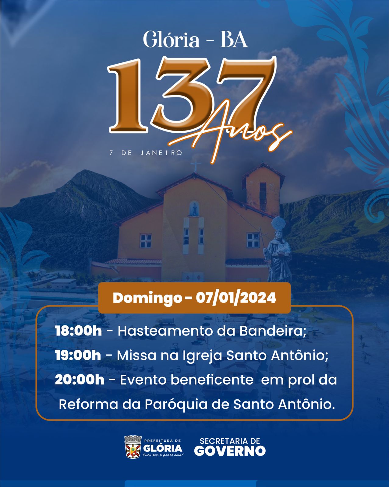 A Prefeitura de Glória, através da Secretaria de Governo, convida a população gloriense para participar da programação da Emancipação Política do nosso Município, que será neste domingo, dia 07/01/2024: