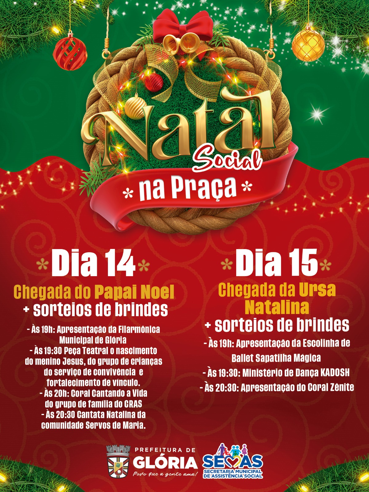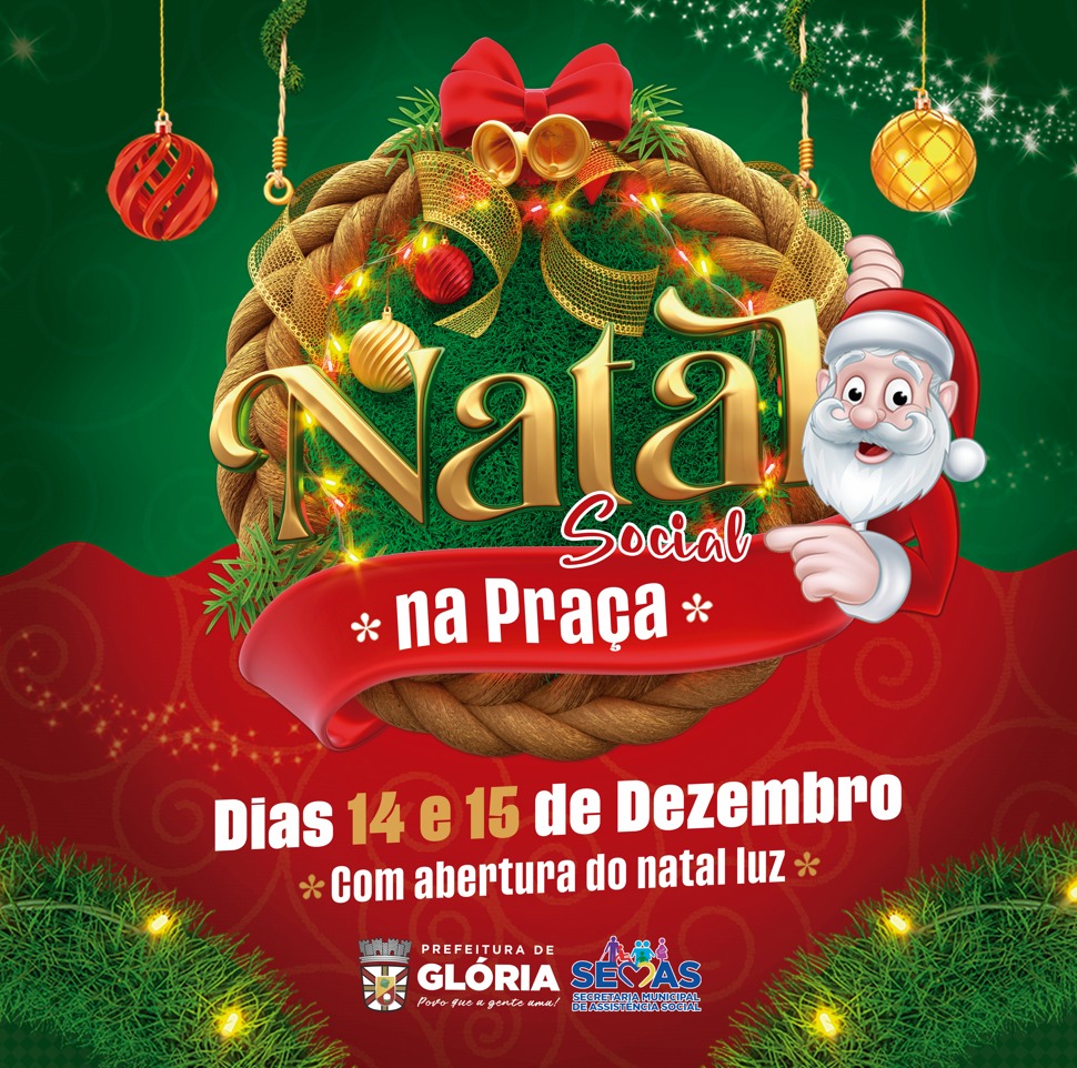 A Prefeitura Municipal de Glória, através da Secretaria Municipal de Assistência Social, convida a todos para prestigiar a tradicional Abertura do “Natal Social na Praça”, que acontecerá no dia 14 de dezembro de 2023, às 19h, na Praça Adair Pereira, na Sede do município.