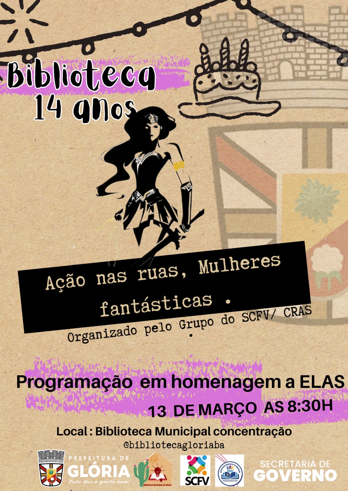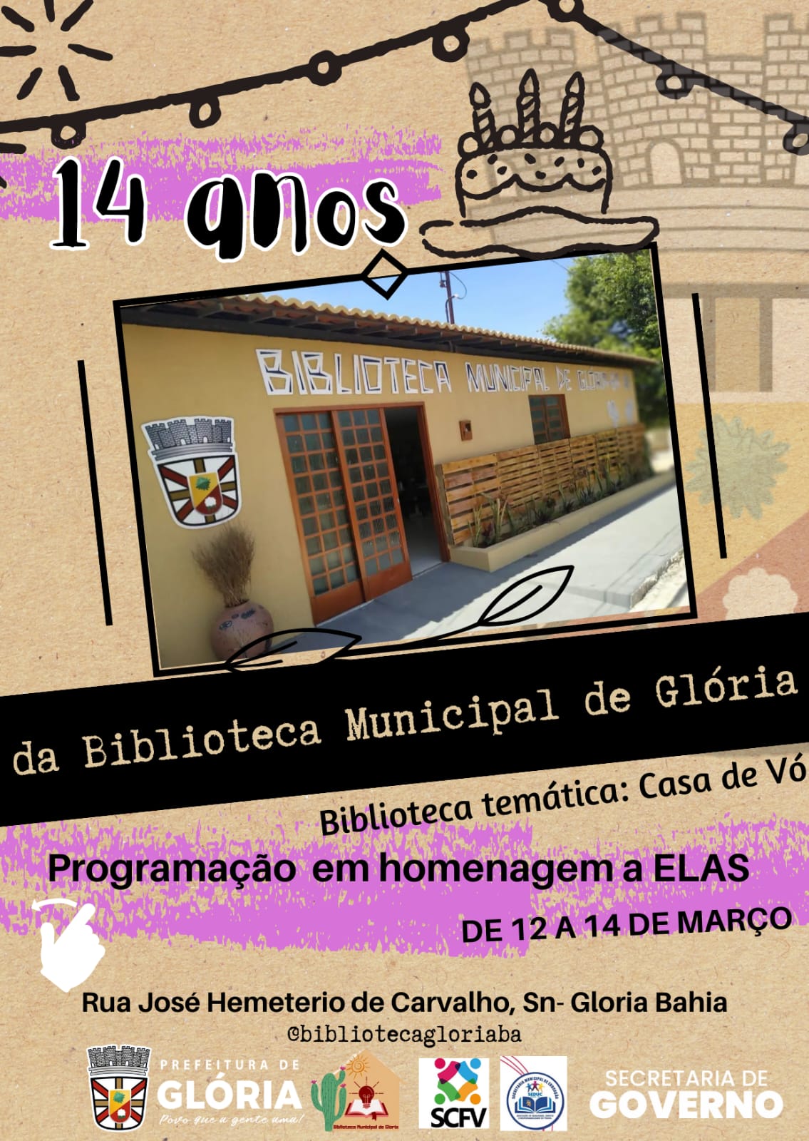 A Biblioteca Municipal de Glória Bahia, completará 14 anos no dia 10 de março de 2024, e será dedicado ao mês das mulheres do município, com uma programação cultural e social que está imperdível.