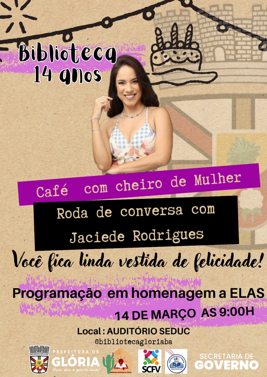 *Dia 12-Oficina de Crochê com a Gloriense, Géssica Silva; *Dia 13-Ações nas Ruas, Mulheres Fantásticas – Organização Grupo SCFV-CRAS; *Dia 14-Café com Cheiro de Mulher. Roda de Conversa com a empresária de Paulo Afonso Bahia, Jaciede Rodrigues. “Você Fica Linda Vestida de Felicidade”. A palestra acontecerá no Auditório da SEDUC.