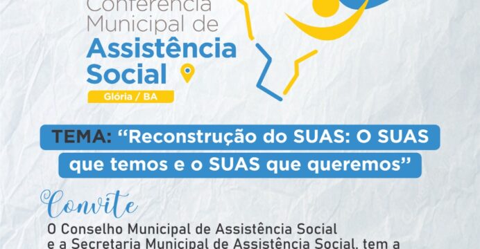 O Conselho Municipal de Assistência Social – CMAS e a Secretaria de Assistência Social – SEMAS, convidam a comunidade gloriense para participar da 10ª Conferência de Assistência Social, com o tema: “Reconstrução do SUAS: O SUAS que temos e o SUAS que queremos”. que acontece na próxima terça-feira, dia 20 de junho, no Centro Diocesano Dom Mário Zanetta, das 7:30 às 14h. A 10ª Conferência Municipal de Assistência Social, é uma realização da Prefeitura Municipal de