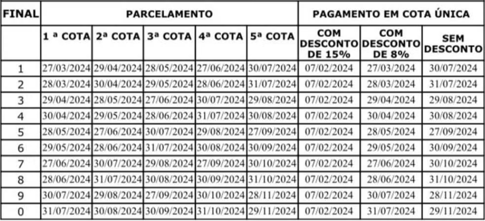 O parcelamento será feito conforme calendário anual que leva em consideração o número final da placa do veículo. [Veja tabela mais abaixo]