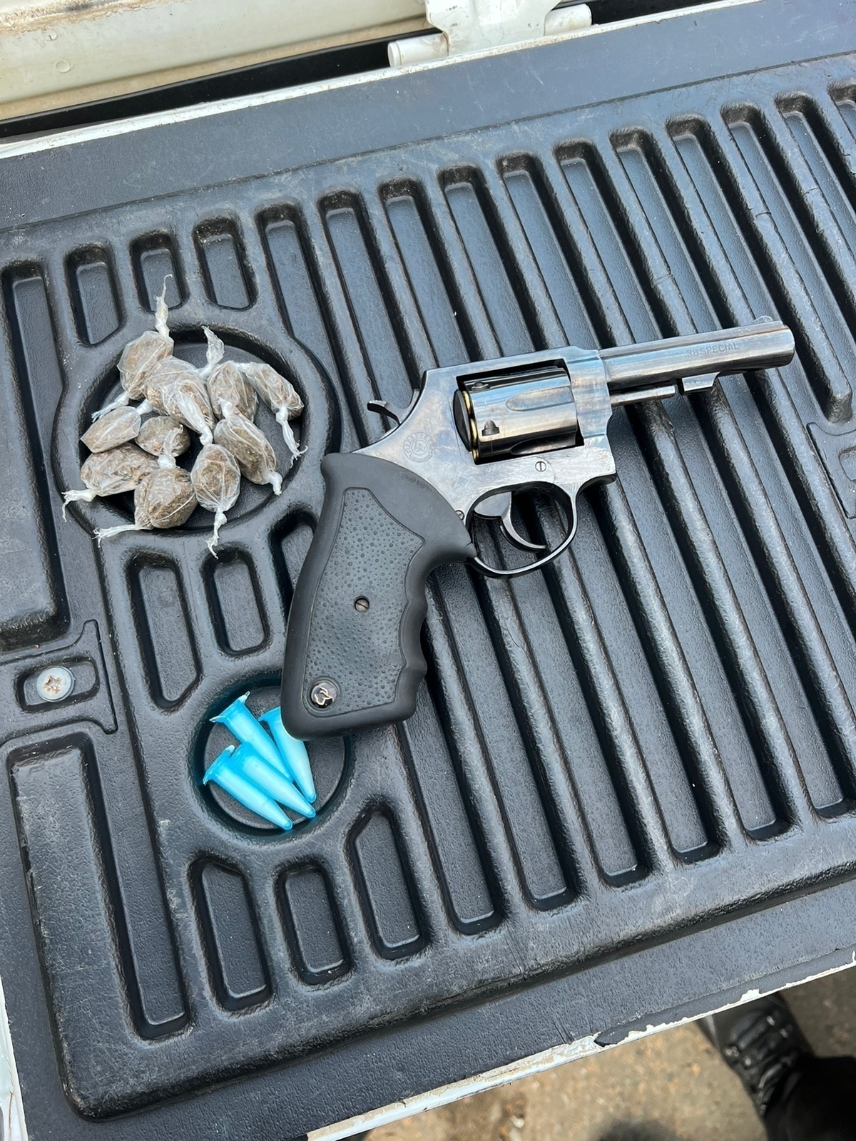 Foi apreendido um revólver cal 38 e drogas com o infrator .