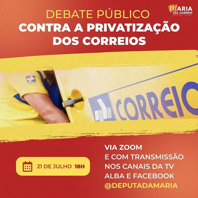 “Não podemos deixar esse governo privatizar uma empresa como os Correios, que dá lucro bilionário e presta um serviço tão importante a todos os municípios brasileiros. A privatização prejudica a logística, os prazos de entrega e o emprego de milhares de trabalhadores. É por isso que eu convido vocês para participar do debate público virtual, amanhã, às 18h, pelas redes da TV ALBA, no canal aberto 12.2 e NET 16, ou pelo meu facebook @deputadamaria. Vamos juntos lutar em defesa dos Correios como uma empresa pública e do povo brasileiro”.