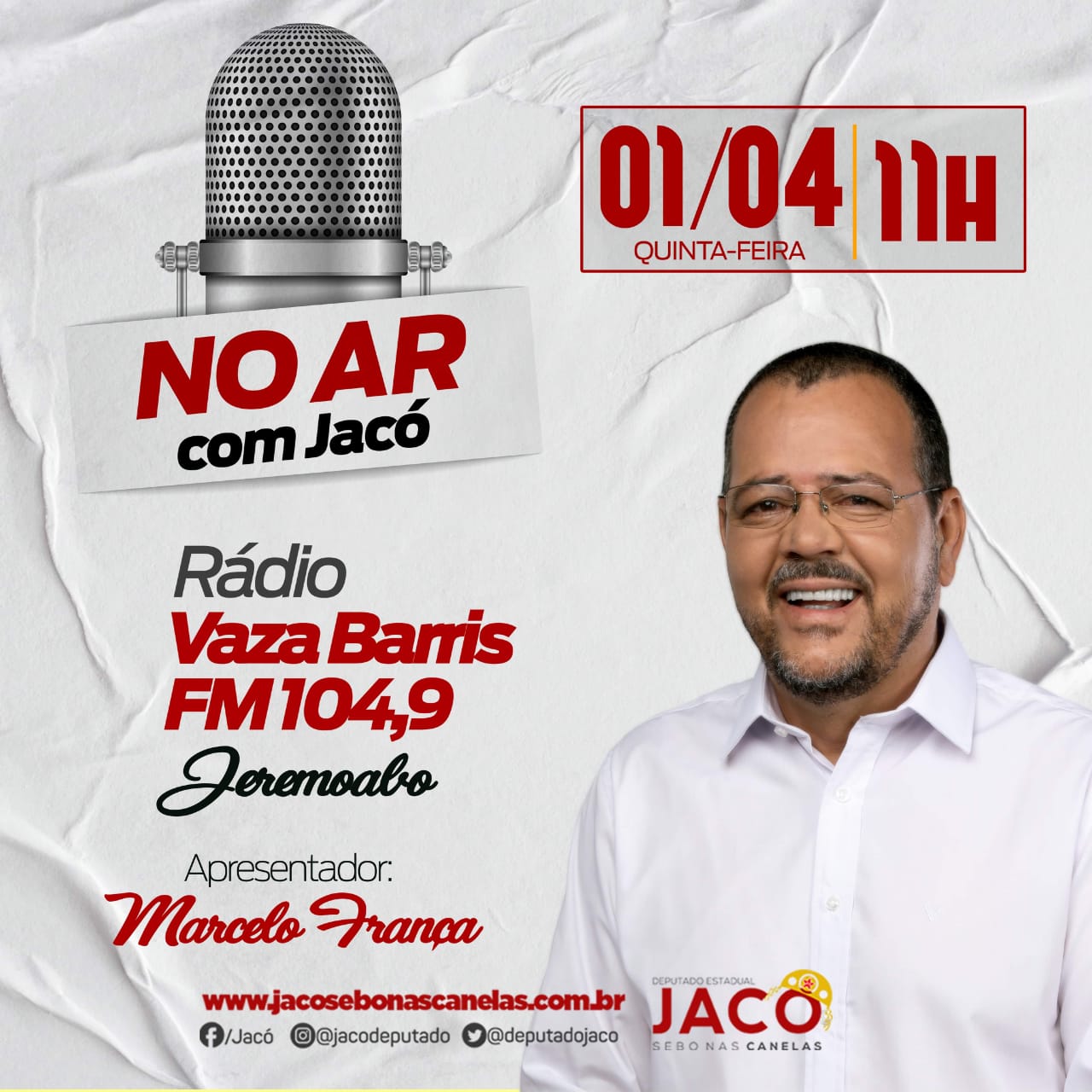 O deputado estadual Jacó Lula da Silva-PT será o entrevistado do Programa No Ar com o Apresentador Marcelo França na Rádio Vaza Barrris na cidade de Jeremoabo Bahia. A entrevista acontece dia 01 de abril de 2021 a partir das 11h.