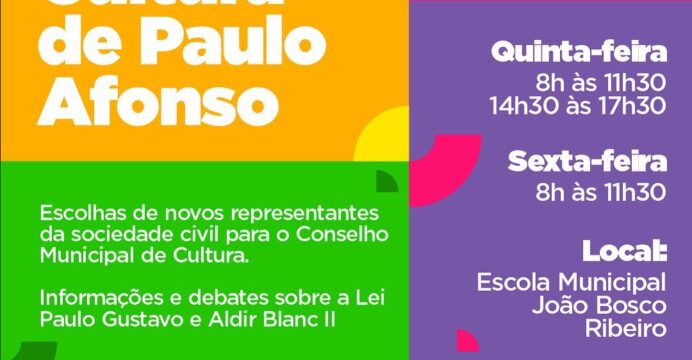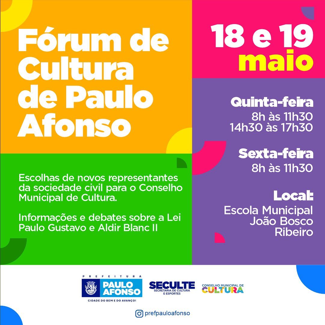 O Conselho Municipal de Cultura (CMC), no uso de suas atribuições, em parceira com a Secretaria de Cultura e Esportes do município de Paulo Afonso, realizará nos dias 18 e 19 de maio no auditório da Escola Municipal João Bosco Ribeiro o Fórum de Cultura de 2023.
