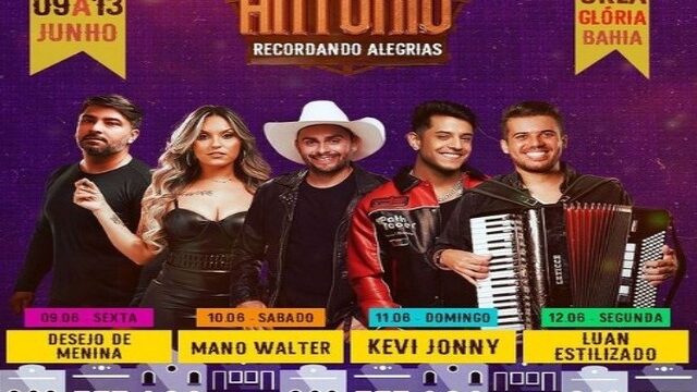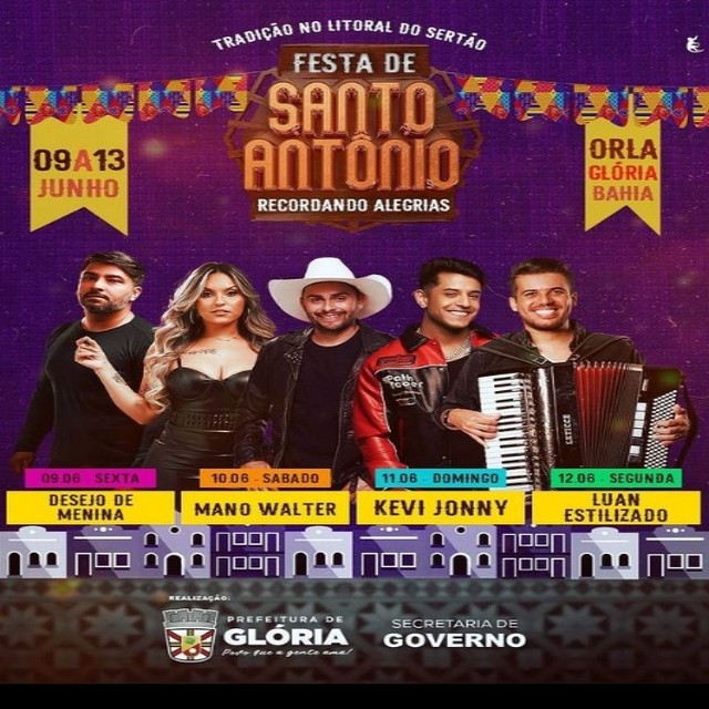 A Prefeitura Municipal de Glória-BA, por meio da Secretaria de Governo, realiza o melhor festejo junino da região, a Festa de Santo Antônio, “Recordando Alegrias”, tradição no Litoral do sertão, de 9 a 12 de junho de 2023, no Balneário Canto das Águas, na Orla de Glória.