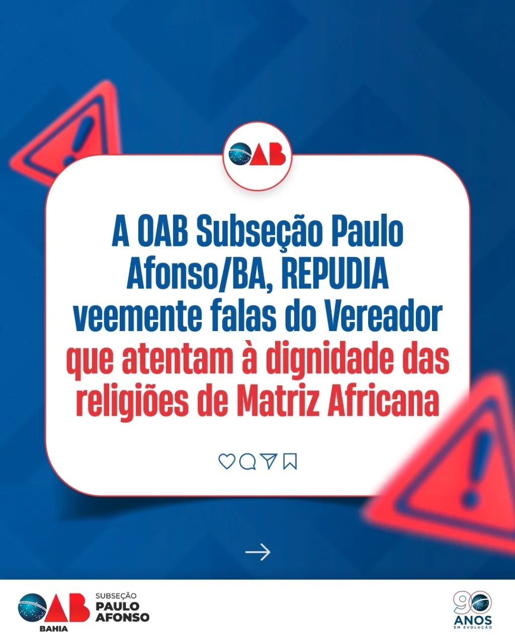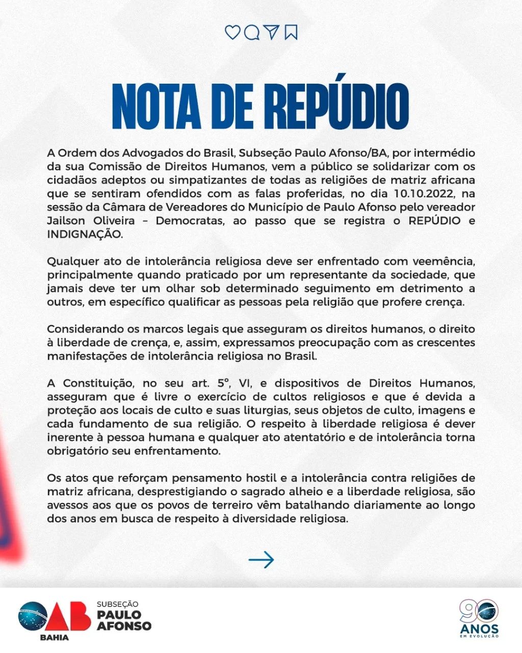 A Ordem dos Advogados do Brasil, Subseção Paulo Afonso/BA, por intermédio da sua Comissão de Direitos Humanos, vem a público se solidarizar com os cidadãos adeptos ou simpatizantes de todas as religiões de matriz africana que se sentiram ofendidos com as falas proferidas, no dia 10.10.2022, na sessão da Câmara de Vereadores do Município de Paulo Afonso pelo vereador Jailson Oliveira – Democratas, ao passo que se registra o REPÚDIO e INDIGNAÇÃO.