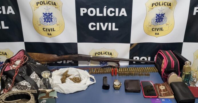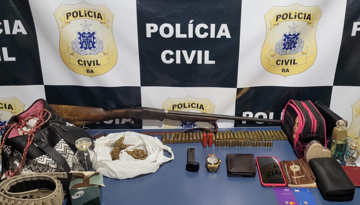 Ao chegarem no endereço indicado, os policiais foram recebidos por Raiane de Souza, que autorizou a entrada e a revista na propriedade. Durante as buscas, sob a cama, foram encontrados diversos itens, incluindo uma porção de substância análoga à maconha, 23 estojos calibre 32 deflagrados, 12 munições calibre 32, 12 munições calibre .40, 8 munições calibre .380 e uma espingarda calibre 32.