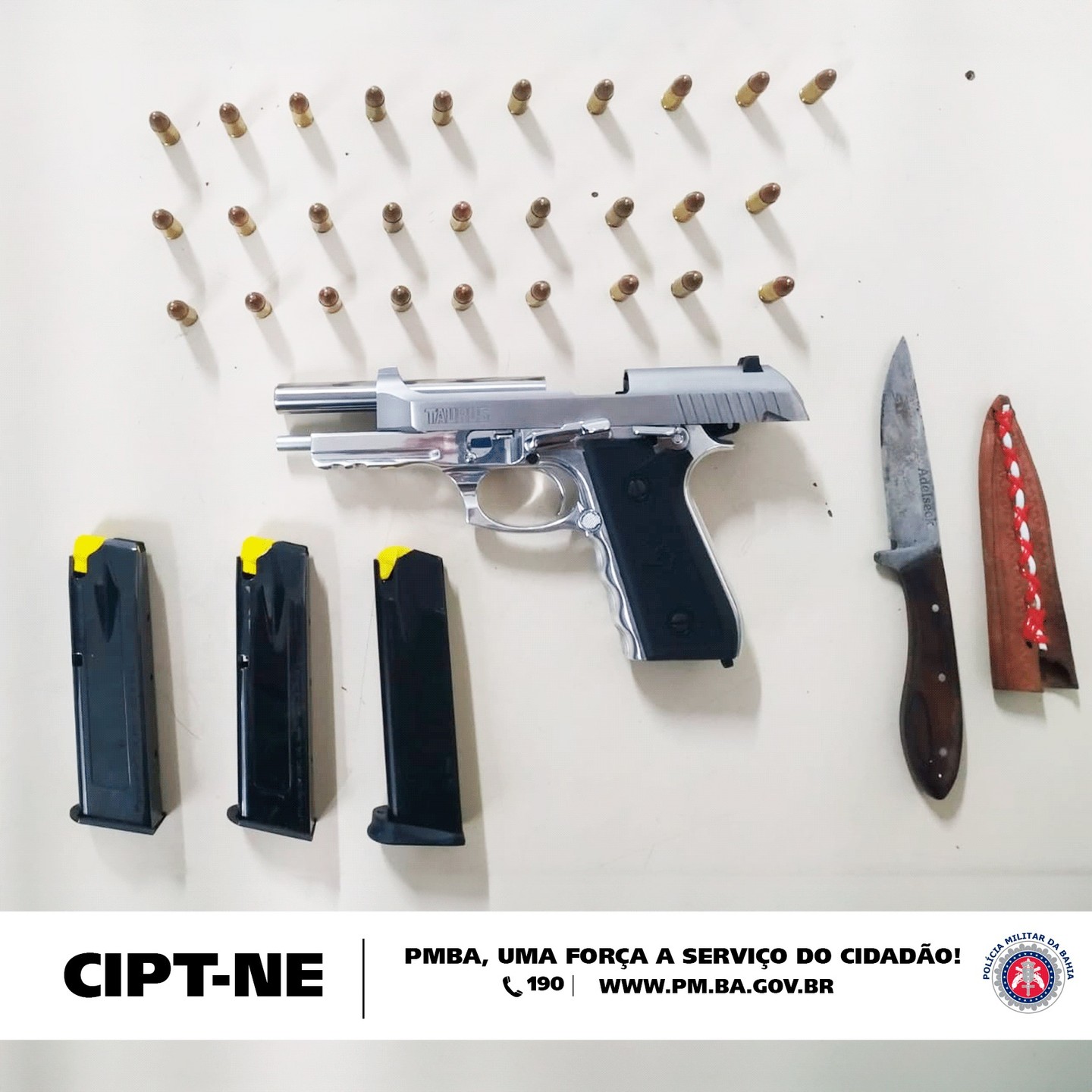 – 01 Pistola Taurus Cal. 9 mm – 03 Carregadores – 28 Munições intactas – PMBA, uma Força a serviço do cidadão! Fonte: ASCOM Rondesp Nordeste.