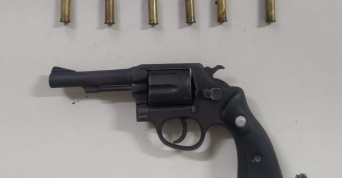 – Um revólver calibre .38; – Seis munições de calibre .38; – Três trouxinhas de substância análoga à maconha.