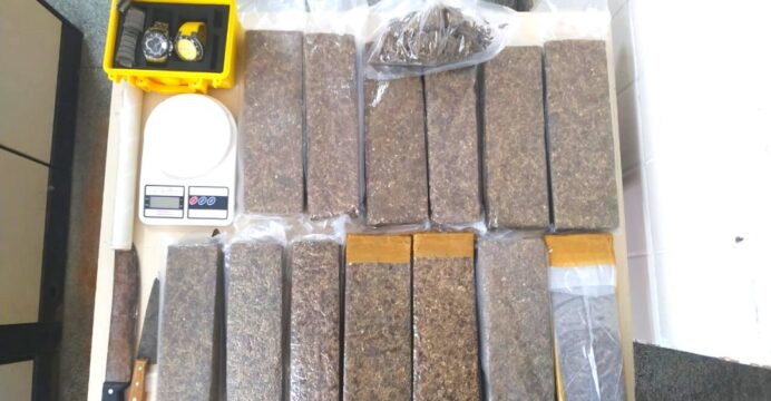 A diligência resultou na descoberta de 13 tabletes grandes e uma porção média de substância com características semelhantes à maconha, albergados em uma caixa de papelão, visíveis através da janela de um dos cômodos. Além do entorpecente, foram encontrados equipamentos usados na preparação e distribuição da droga, incluindo uma balança digital de precisão branca, material de embalagem e armas brancas.