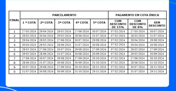 O imposto do exercício de 2024 só poderá ser parcelado se o valor do débito for igual ou superior a R$ 120,00. A Sefaz-BA lembra que a opção do parcelamento referente a débitos anteriores a 2024 será admitida apenas caso este pagamento ocorra junto com o do exercício de 2024.