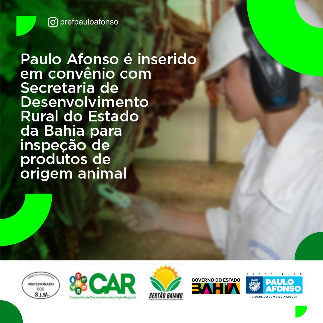 Para promover o desenvolvimento de ações voltadas para a inspeção de produtos de origem animal, foi celebrado o convênio nº 112/2023 voltado para o Serviço de Inspeção Municipal (SIM), onde o município de Paulo Afonso foi inserido. O pacto foi selado entre o Consórcio de Desenvolvimento Sustentável do Território do Sertão Baiano e a Secretaria de Desenvolvimento Rural do Estado da Bahia (SDR), por meio da Companhia e Desenvolvimento e Ação Regional (CAR).