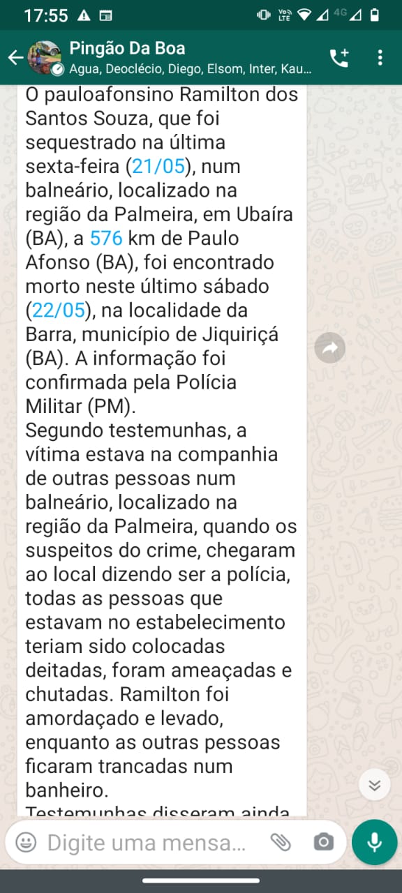 Um homem identificado por Ramilton dos Santos Souza, que teria sido “sequestrado” em Ubaíra, por volta de 23h40min de sexta-feira (21), foi encontrado morto neste sábado (22), na localidade da Barra, município de Jiquiriçá, a informação foi confirmada pelo Mídia Bahia junto a Polícia Militar.