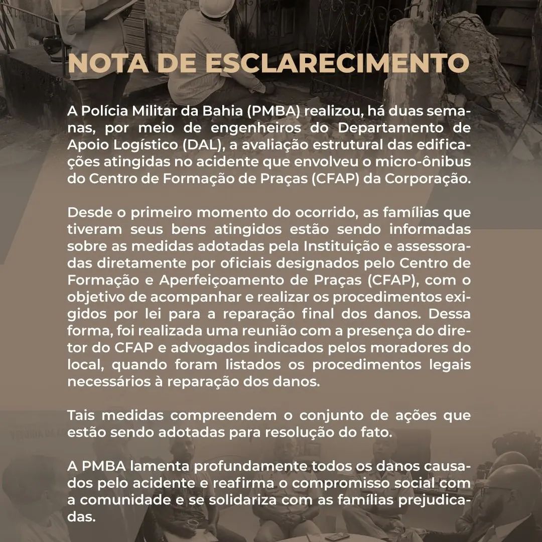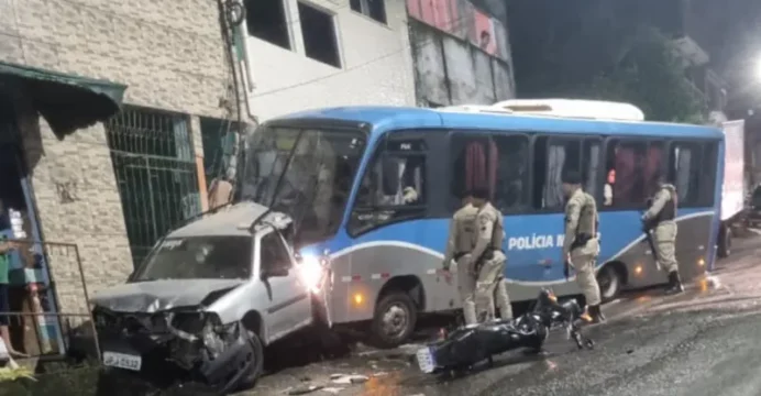 Foto: Reprodução/Redes Sociais Um micro-ônibus da Polícia Militar bateu em duas casas e três veículos após ficar desgovernado na noite desta terça-feira (13), no bairro de Plataforma, no subúrbio ferroviário de Salvador. Um dos imóveis teve a estrutura danificada e foi condenado pela Defesa Civil (Codesal). O acidente aconteceu por volta das 18h10. Segundo a PM, o micro-ônibus transportava alunos do Curso de Formação de Soldados, que faziam uma visita à área de responsabilidade da 14ª Companhia Independente (CIPM), quando o coletivo teria apresentado falhas mecânicas. Os veículos atingidos são dois carros e uma motocicleta. Imagens registradas após o acidente mostram um dos carros totalmente destruído. O Serviço de Atendimento Móvel de Urgência (Samu) chegou a ser acionado, porém, segundo a Superintendência de Trânsito (Transalvador), ninguém ficou ferido. Foto: Reprodução/Redes Sociais O micro-ônibus deve seguir no local do acidente até a quarta-feira (14), quando a casa condenada pela Codesal será escorada. Antes disso, há risco do imóvel desabar caso o veículo seja removido. Conforme a Transalvador, a rua onde aconteceu a batida é local e tem pouco trânsito. O tráfego segue liberado para moradores. Em nota, a PM informou que “todas as medidas legais e administrativas foram imediatamente adotadas pela equipe da PM que se fez presente durante toda a ocorrência”.