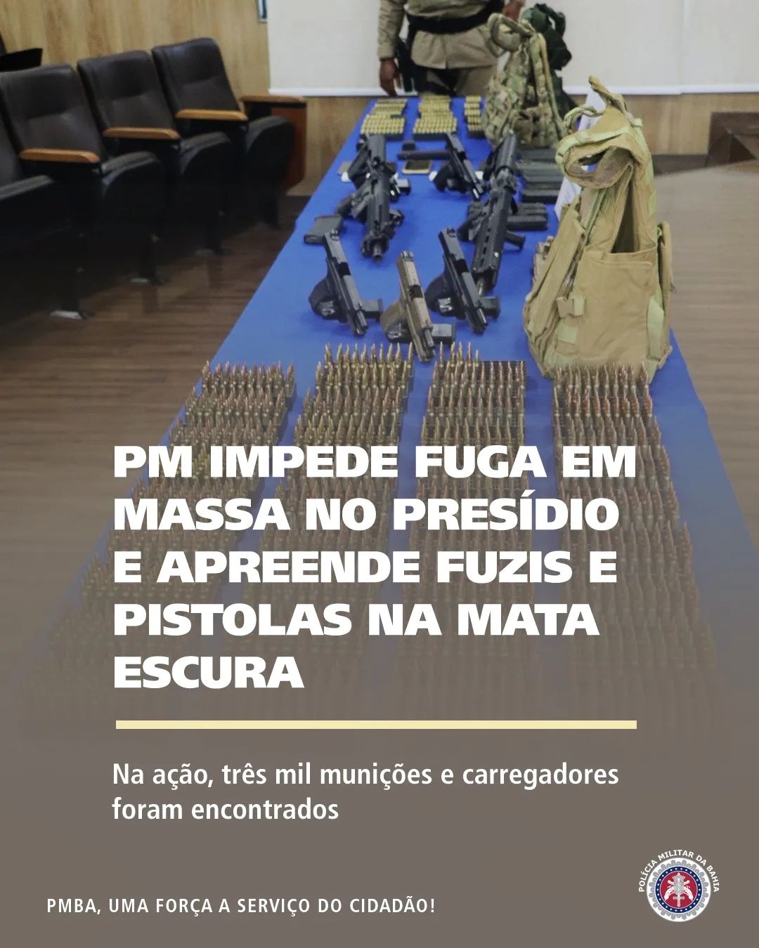 Policiais Militares impediram a fuga em massa de presos da penitenciária Lemos de Brito, no bairro de Mata Escura, em Salvador, e apreenderam sete armas de fogo, cinco pistolas e dois fuzis, quase três mil munições, diversos carregadores de fuzil, coletes balísticos, roupas e celulares, no sábado (21). O material apreendido estava no entorno do complexo penal e foi apresentado à imprensa na manhã deste domingo (22) no Quartel do Comando Geral da PM, no Largo dos Aflitos.