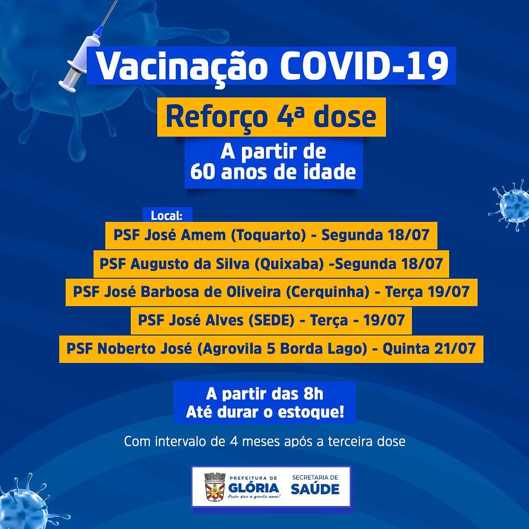 A Prefeitura Municipal de Glória-BA através da Secretaria Municipal de Saúde, dando continuidade ao cronograma da vacinação contra Covid-19, nesta segunda-feira, terça-feira e quinta-feira, dias 18,19 e 21 de julho, aplica vacinação de reforço da 4ª dose para pessoas a partir de 60 anos.