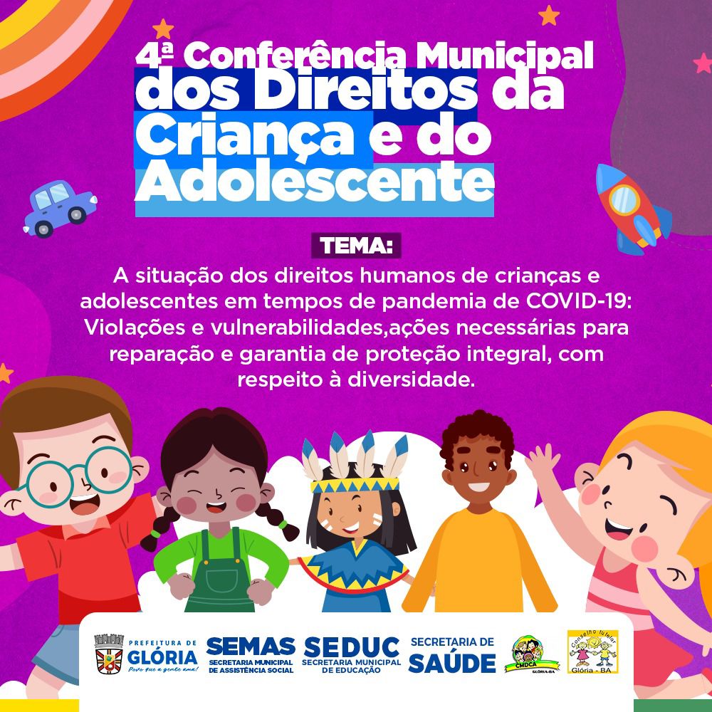 A Prefeitura Municipal de Glória (BA) e o Conselho Municipal dos Direitos da Criança e do Adolescente realizam nesta quarta-feira, dia 30 de novembro de 2022, das 07h30 às 14h, no Centro Diocesano de Glória, a 4ª Conferência Municipal dos Direitos da Criança e do Adolescente, com o tema: